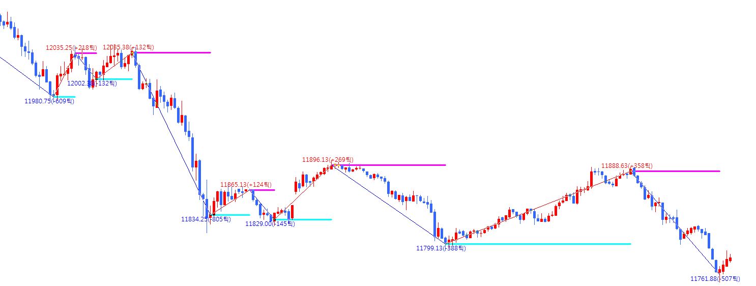 - 2분봉(외부변수) 또는 틱봉 챠트에서 2시간(외부변수) 간격의 상승과 하락