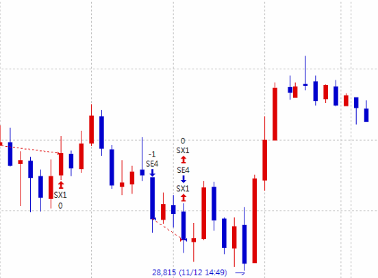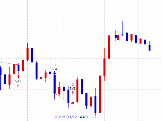 적용하신 시스템은 SE4가 매도진입, SX1은 매도포지션청산입니다.