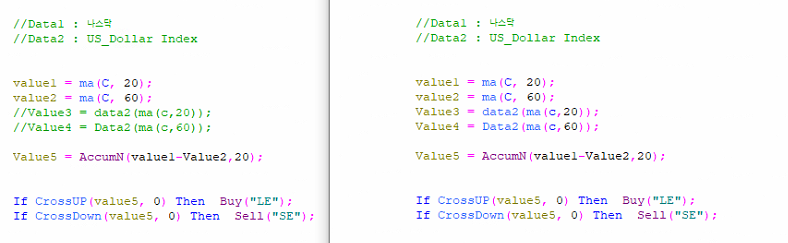아래 첨부파일의 코드에서 data2의 지표를 주석으로 적용할때와 안할때의 결과값이 다릅니다.