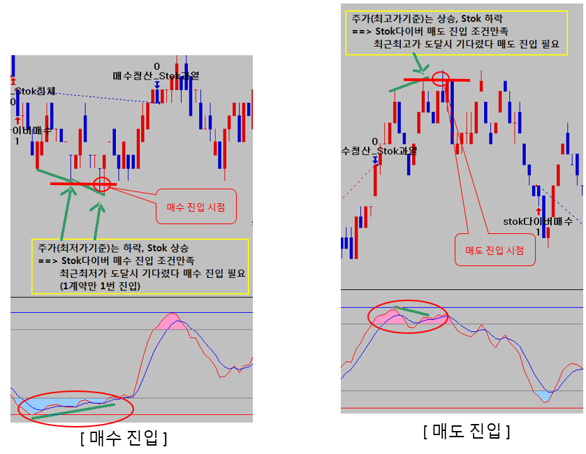 주가(최고가, 최저가) 대비 Stok 반대되었을때 조건만족하며..