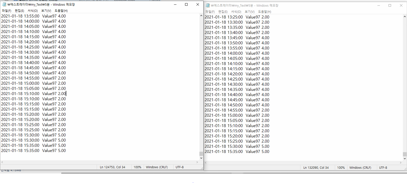 사진에 보면, 왼쪽그림은 장 중에 저장한 파일이고, 오른쪽은 장 마감 후에, 방금전에 열어본 파일입니다.