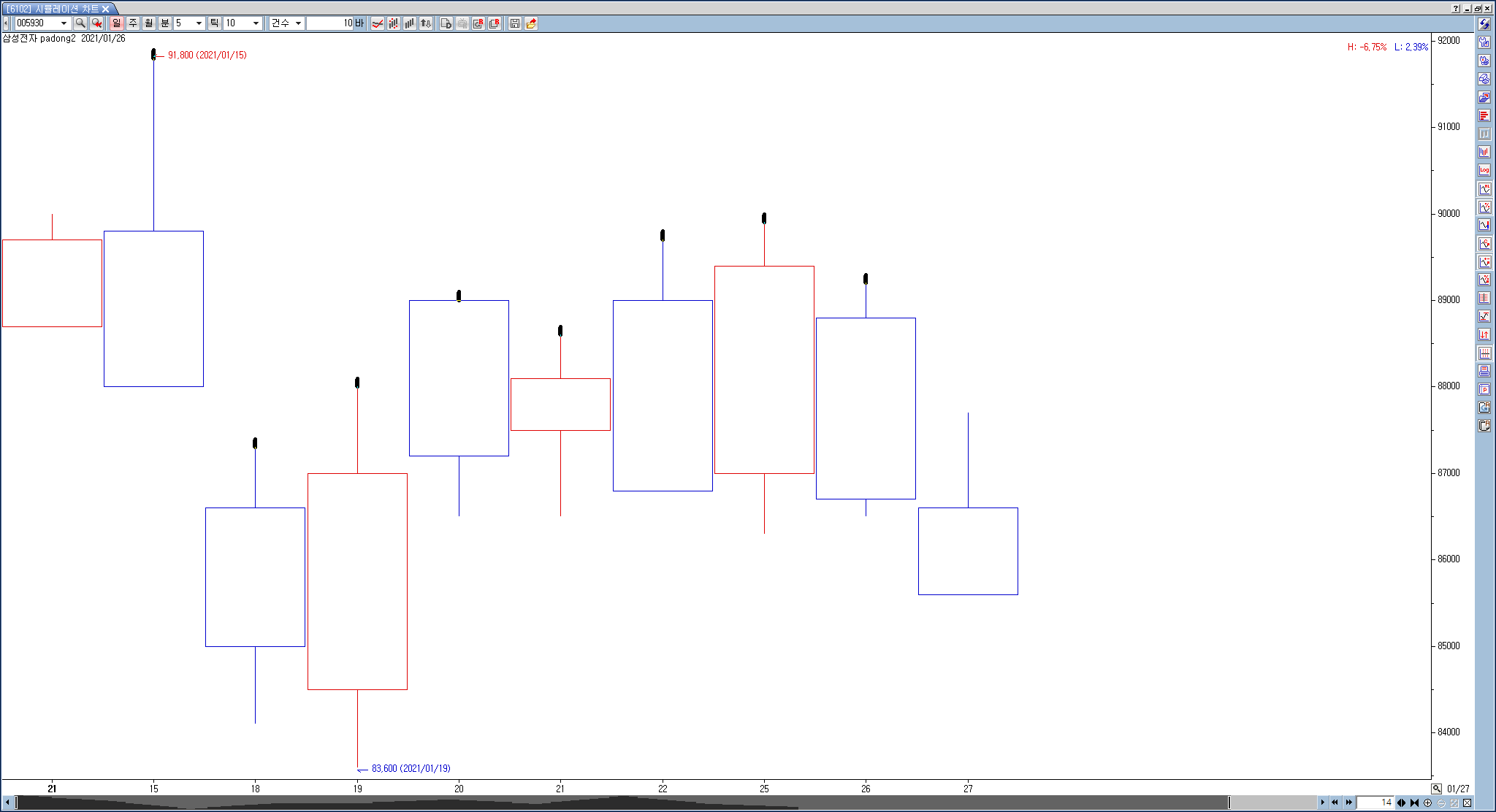 차트의 마지막봉은 미완성봉으로 해당봉에서는 표시할 방법이 없습니다.