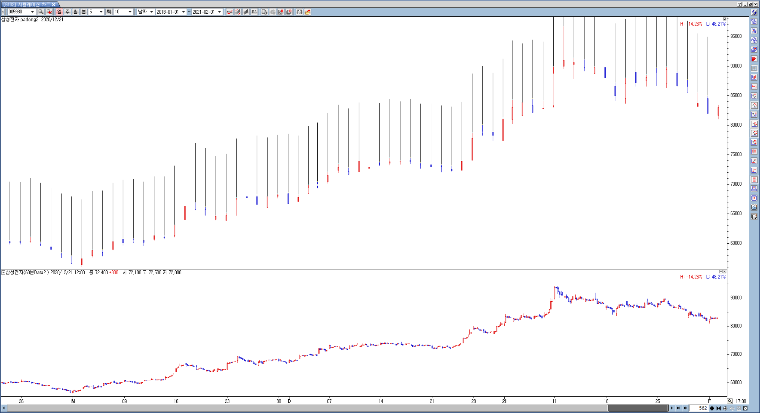 그날 60분봉 기준 최고가와 최저가 발생시간 기준으로 신호가 발생합니다.