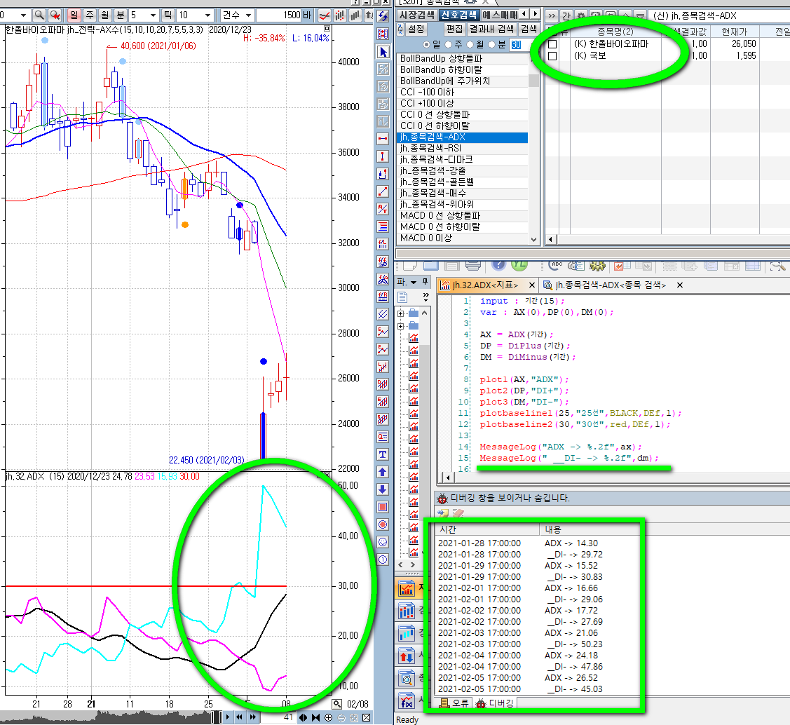 ADX 30이상에서 DI- 가 크로스다운 되는 것을 찾는 것인데요!!