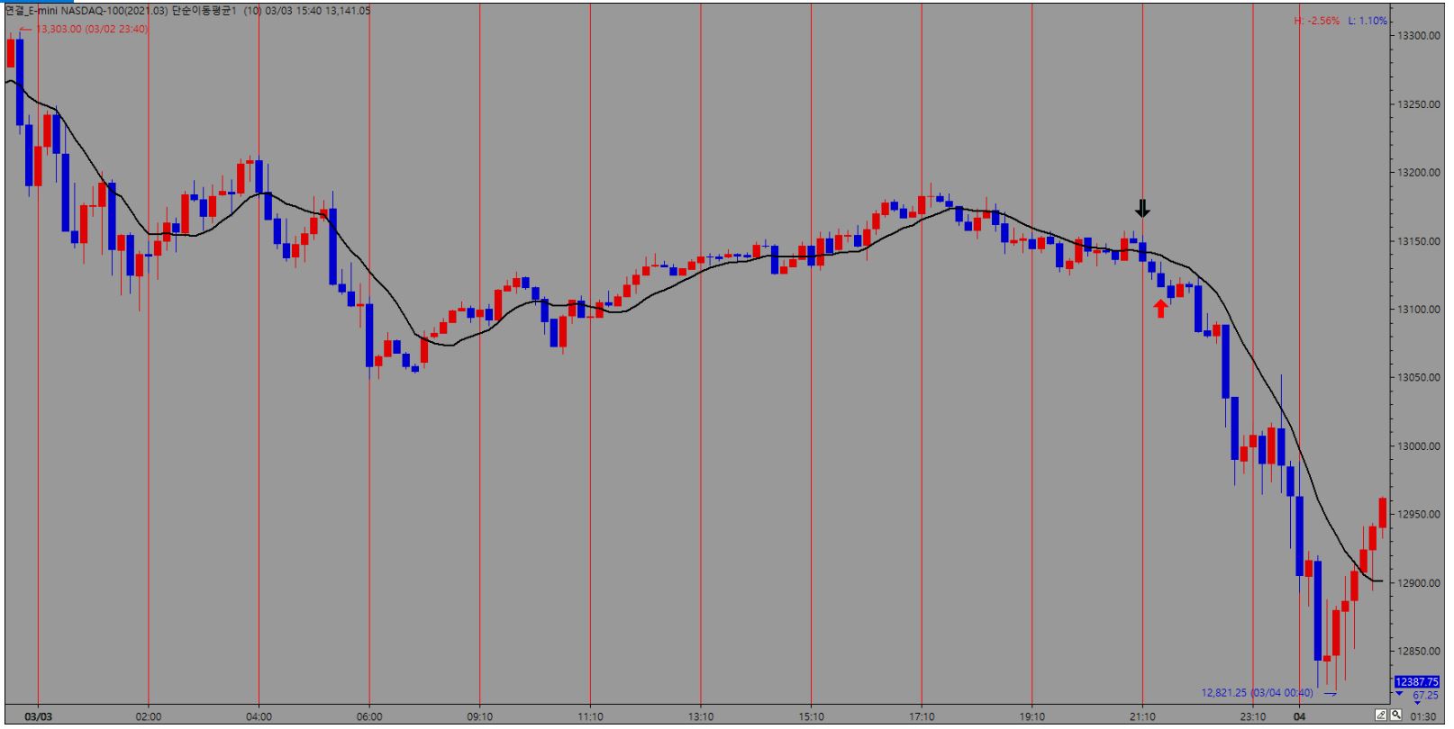 ex) 나스닥 10분봉 수평선 : 13,100 일 때 ->
