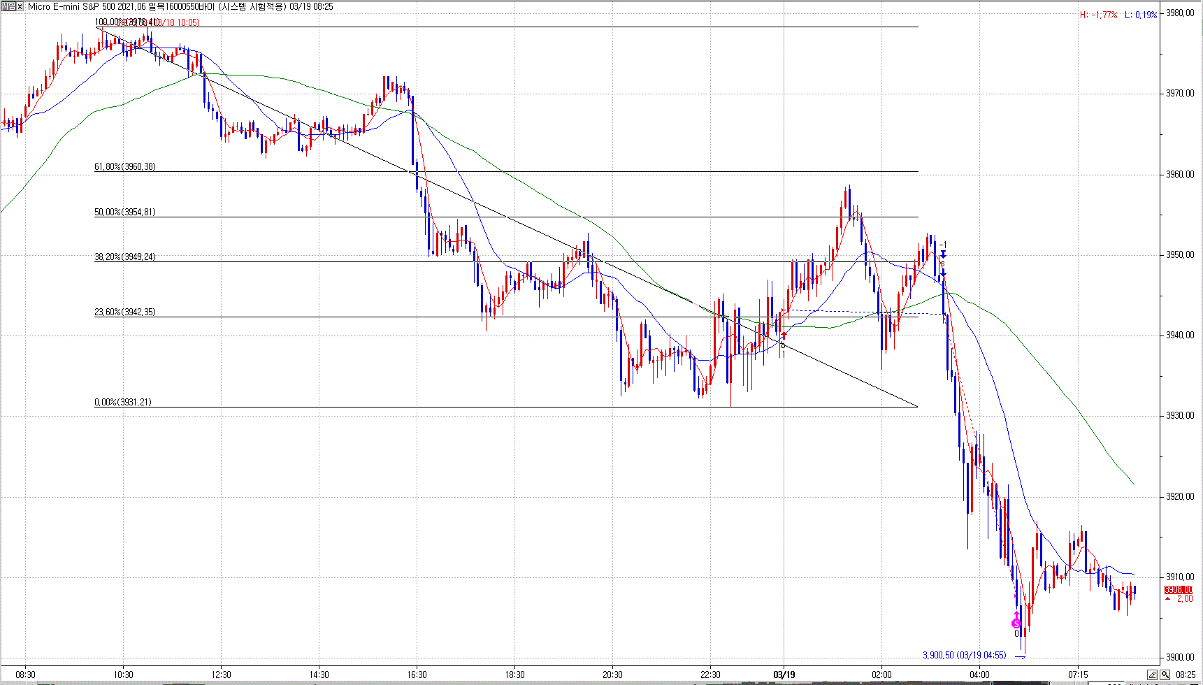 > 위 그래프의 07시부터 익일 03시까지 피보나치 수열이 61.8% 되돌림에 매도후 0%에 청산하는 수식어를 부탁 드립니다