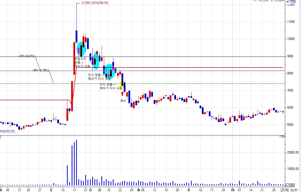 2-1. 최초 3일저가 지지가 중간 값(최초 E1) 이하에서 나오면, 3일지지 저가에 오면 매수
