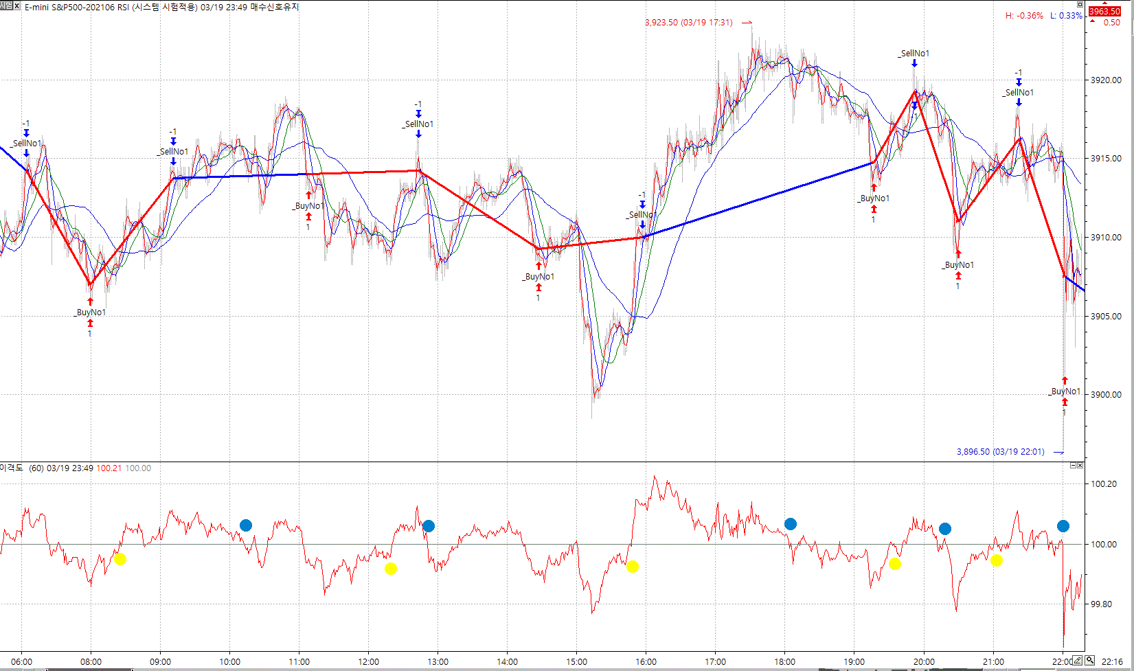 그래프의 파란색은 매도진입신호후 주문을 이격도 60에 기준선 크로스다운에 매도