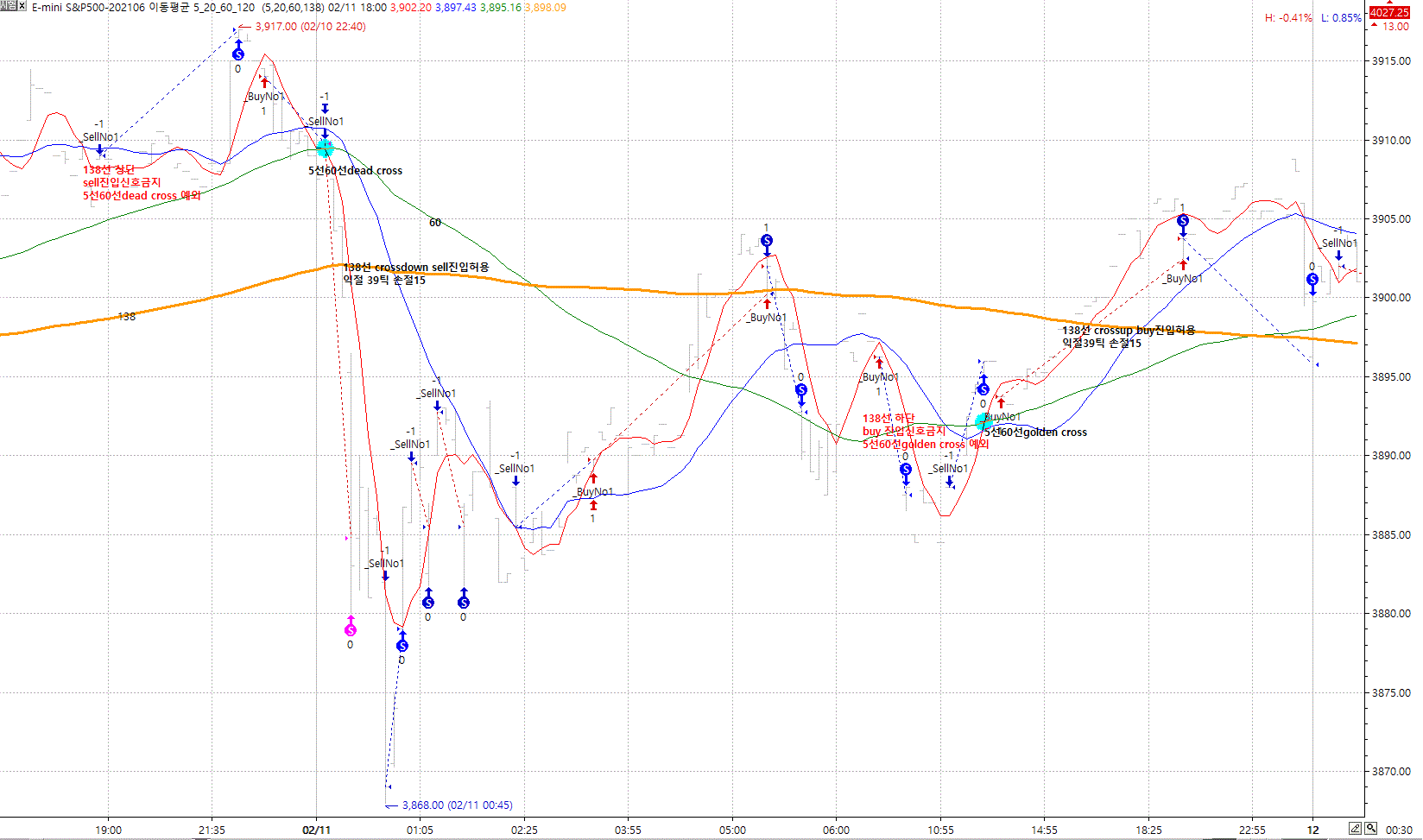 예외 :- 캔들이 138선 crossup일때 익절+35틱 손절-20틱