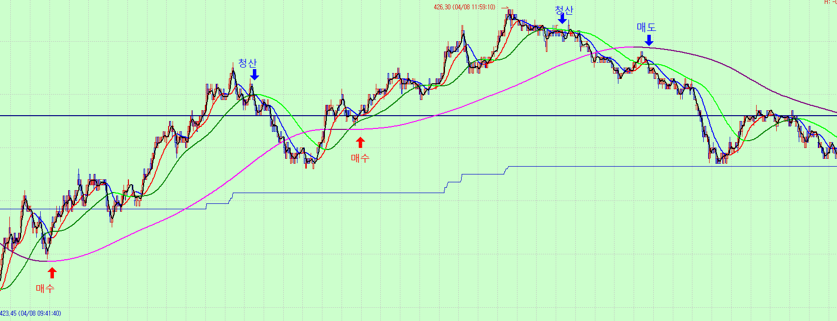 매수시점이 다시보면 20선이 240선을 Crossup해서 꺽이고 난뒤 240선 위에서 다시 변곡이 나오는 3파동째가 진입구간입니다