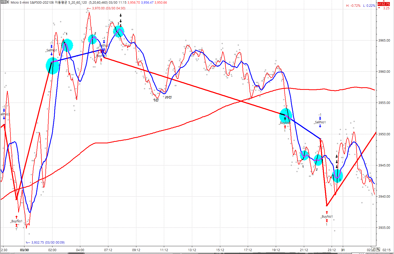 sell신호후 5선 20선 3번째 데드크로스일때 진입의