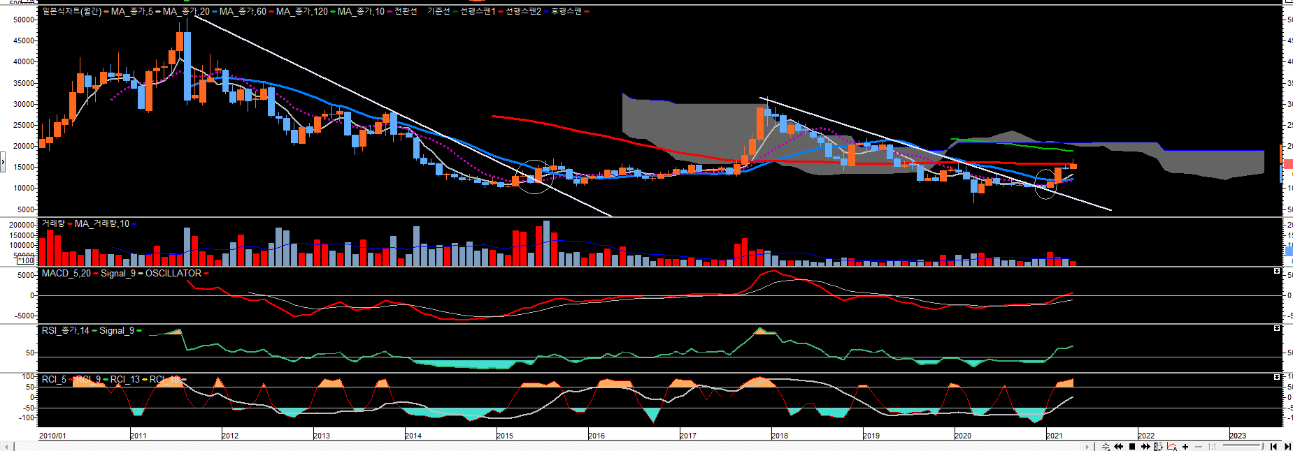 월봉챠트에서 2년이상 형성된 하락추세선을 돌파한 종목을