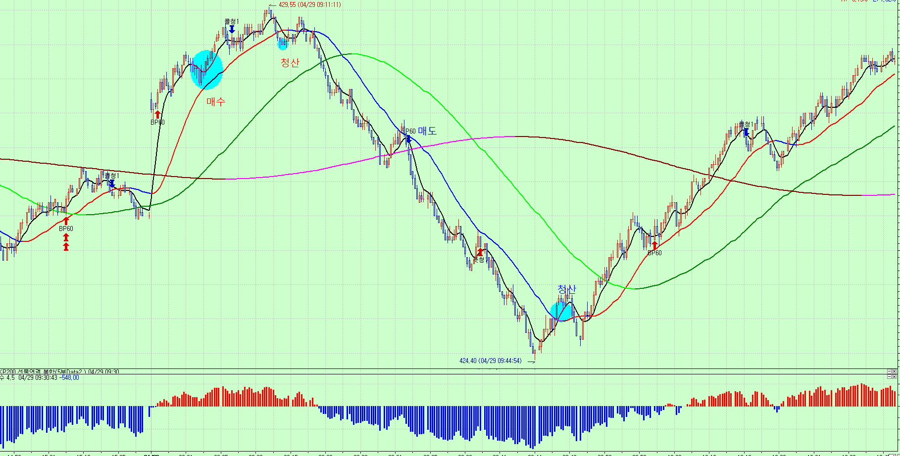 > 1. 장시작시 60선위에서 5선이 상승 변곡이 나오고, 캔들 몸통의 절반이 5선이 위에 있을때 매수인데..바로 매수가 들어가네요....