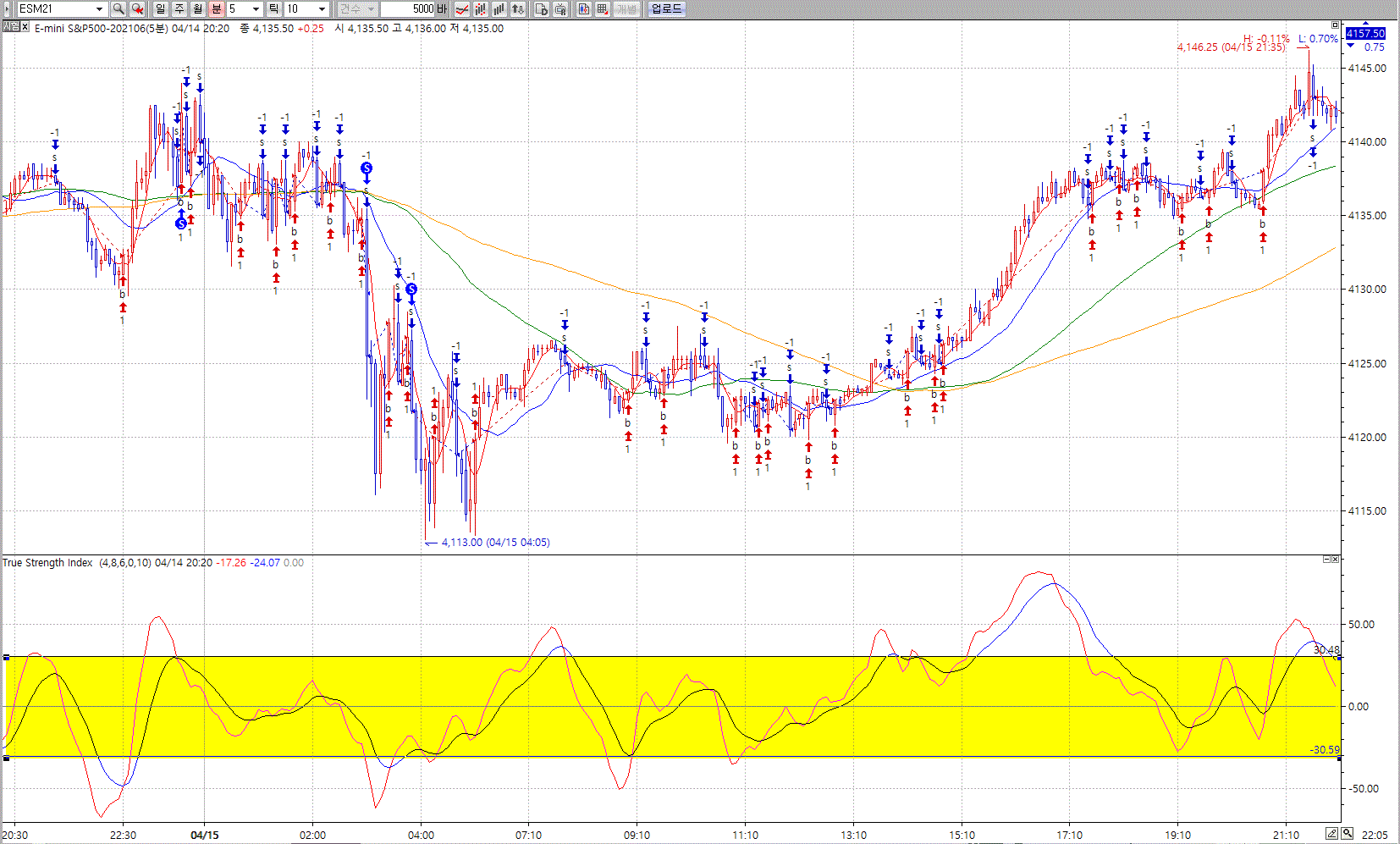 True Strength Index 지표의 +30.5 ~-30.5 사이 진입신호금지 수식어의 추가와 매매시간을 10시부터 익일 05시까지로 수정을 부탁드립니다.