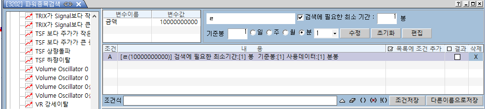 2.파워종목검색에서 어떻게 설정을 해야 당일 조건을 만족하는 종목이 나올까요??