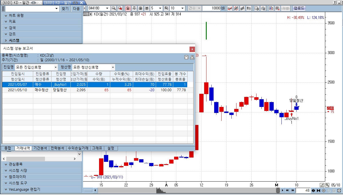 5월7일봉의 시가는 2010이고 고가는 2235으로 청산식의 if조건에 충족됩니다.