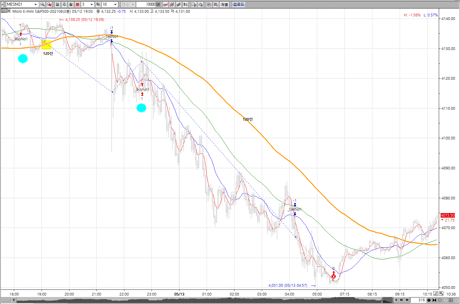 120선 아래 buy신호는 sell전환 손절15틱 익절 50틱