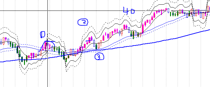 3번- 조정을 이동평균선5를 종가로 2번이상 깨고 (이동평균선 20 빼기2틱)을 안 깸