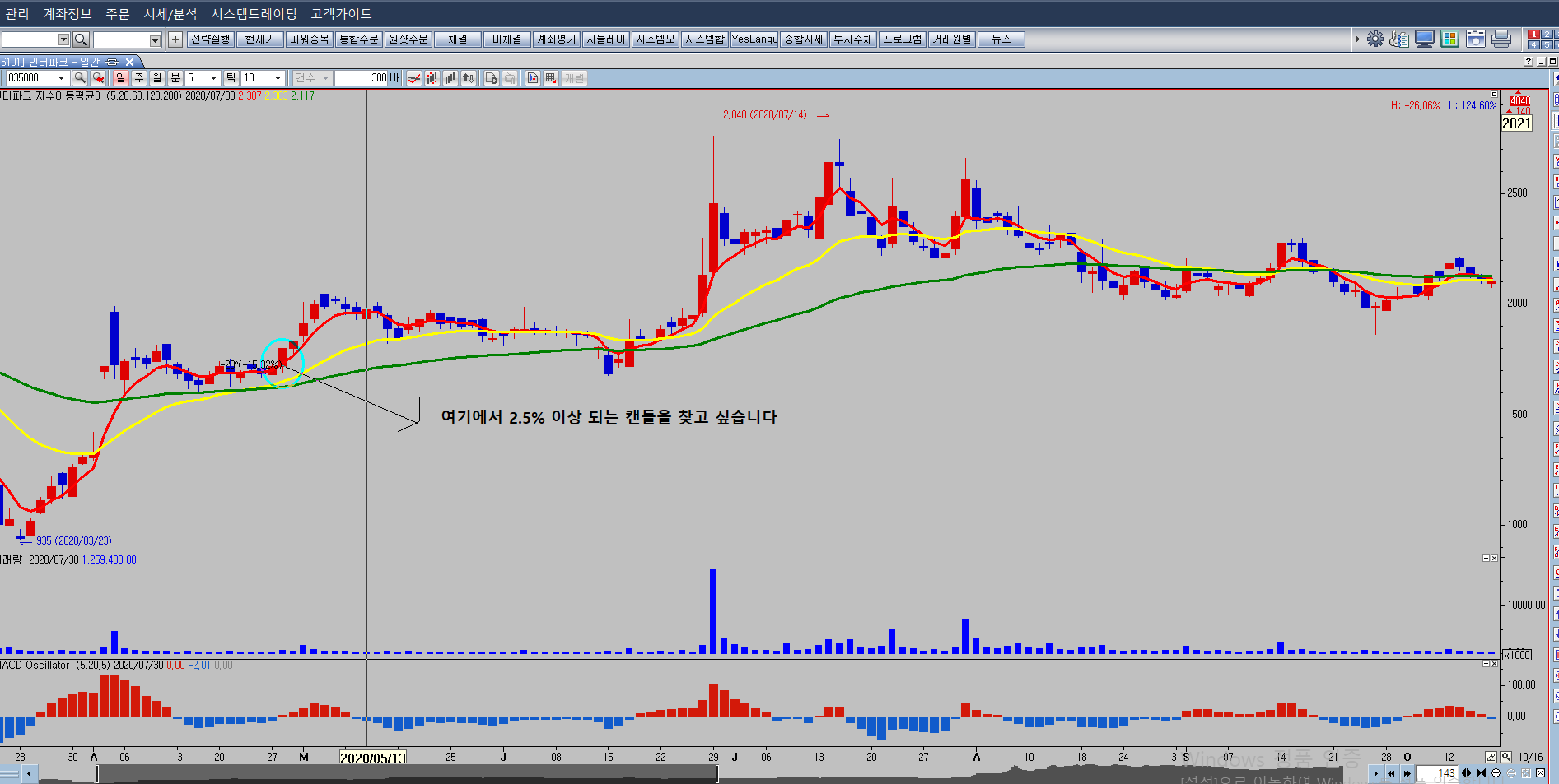 3번, 주가가 5일선 재 안착시, 2.5% 이상 되는 캔들이 나왔을때 검색을 하게 부탁 드립니다
