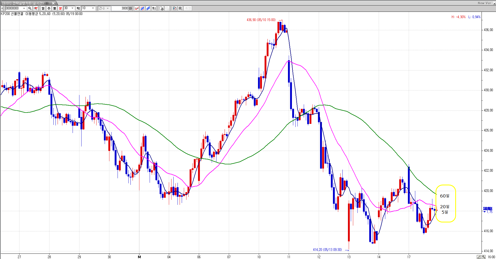 보내주신 수식을 적용하니 416선이나오고 이상합니다.(X7로 올라가는듯 합니다. 2일선이 14일선으로 표시되구요). 5분봉이든 30분봉이든 이동평균선들을 그대로 나타내기 위해서 60분봉 기준 7로 잡았던 겁니다. 즉 어느분봉에서든 일선은 변하지 않게 하고 싶습니다.첨부그림처럼 그냥 단순하게 표현하고 싶습니다. 요지는 선들이 오밀조밀하게 모여있을때 구분하기 어려워서 숫자로 표현하고 싶은겁니다. 색깔과 텍스트크기만 조절할수 있으면 좋겠습니다.번거롭게 해드려서 죄송합니다.