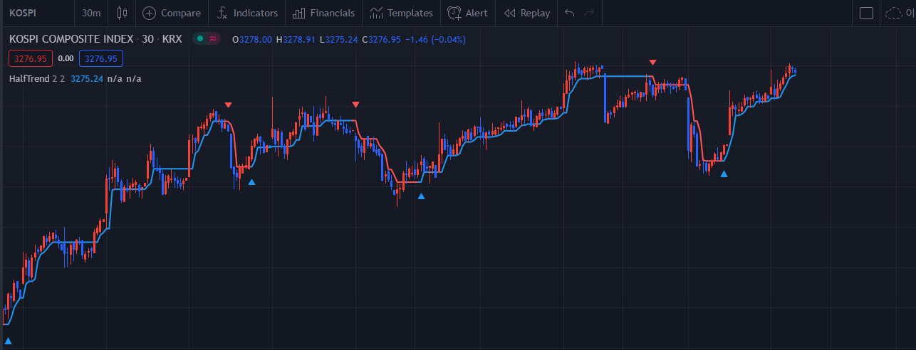 plot1(ht, "HalfTrend",iff(trend == 0 ,BLUE,RED));