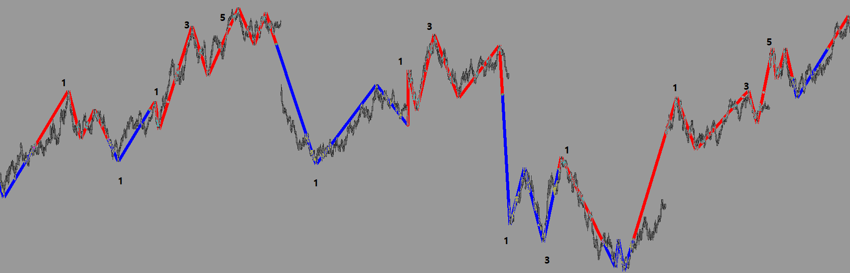 빨간색 파동에서는 직전고점을 돌파한 고점만 카운팅 1,3,5,7,9,..