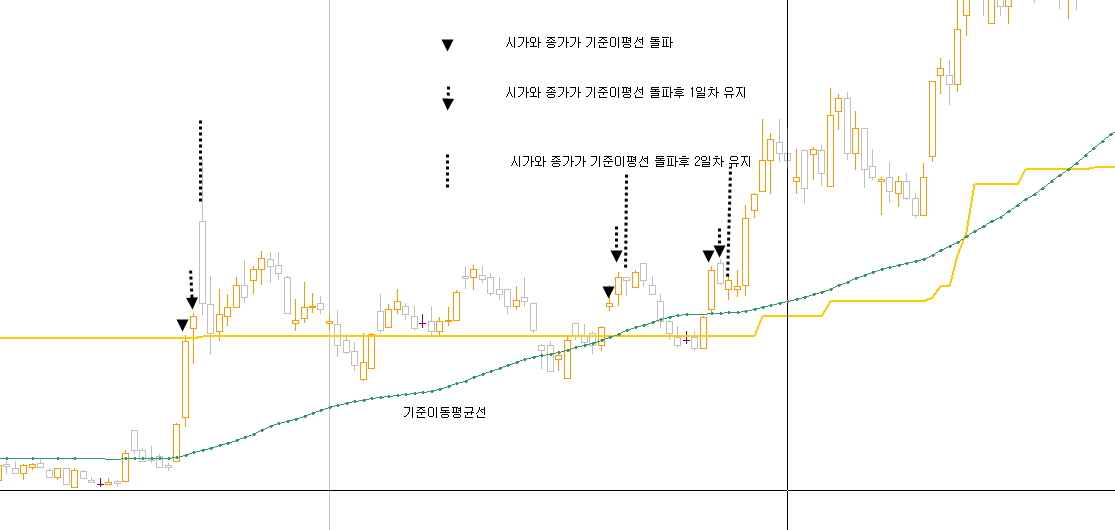 3. 시가와 종가가 기준이평선(60) 돌파후 2일차 기준이평선 상단 유지 캔들 검색