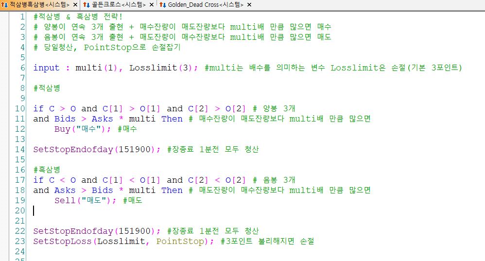 input : multi(1), Losslimit(3); #multi는 배수를 의미하는 변수 Losslimit은 손절(기본 3포인트)