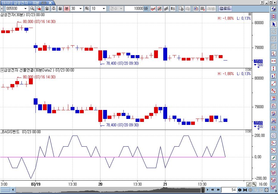 첨부한 사진처럼 베이시스(삼성전자 주식 가격 - 삼성전자 선물 가격)를 이용해서