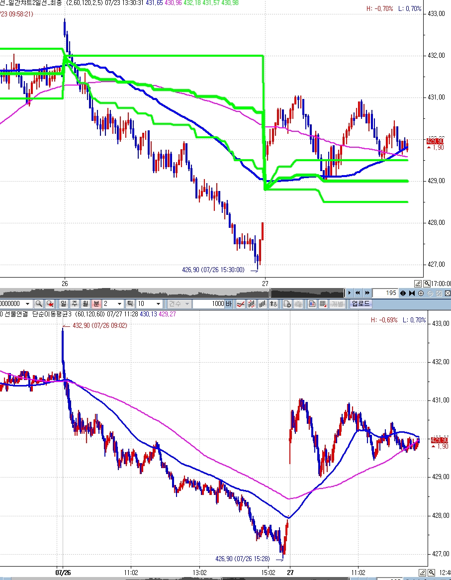 아래 그림은 250틱챠트에서 2분봉 챠트의 60선과 120선을 표현하는 것입니다.