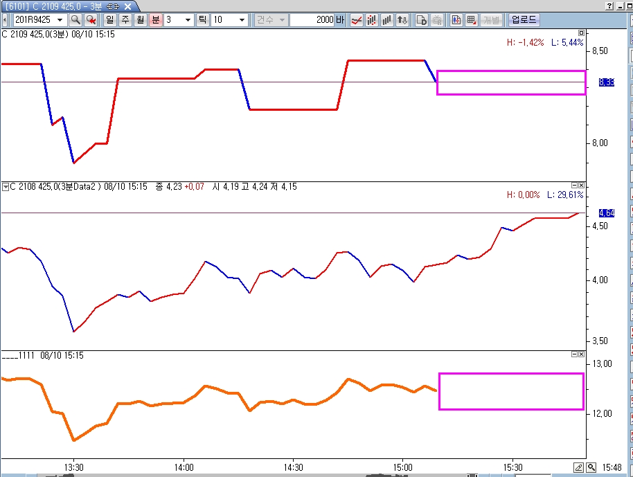 콜 9월물 425 와 8월물 425의 양합선을 예시로 그려 본 것입니다.