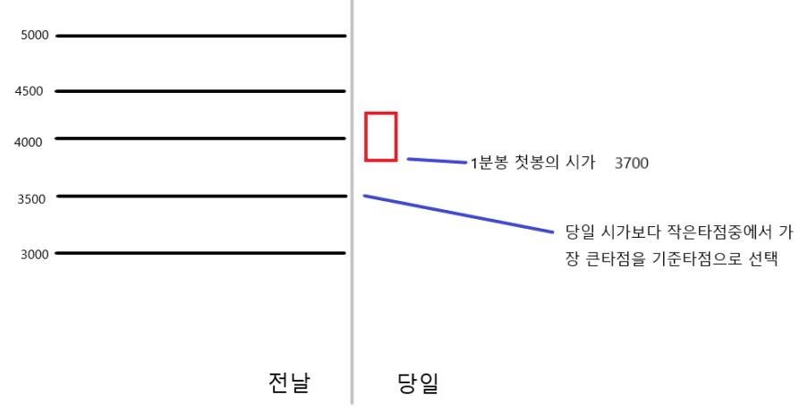 #5개의 타점중 시가보다 작은것 중에 젤 큰값 계산