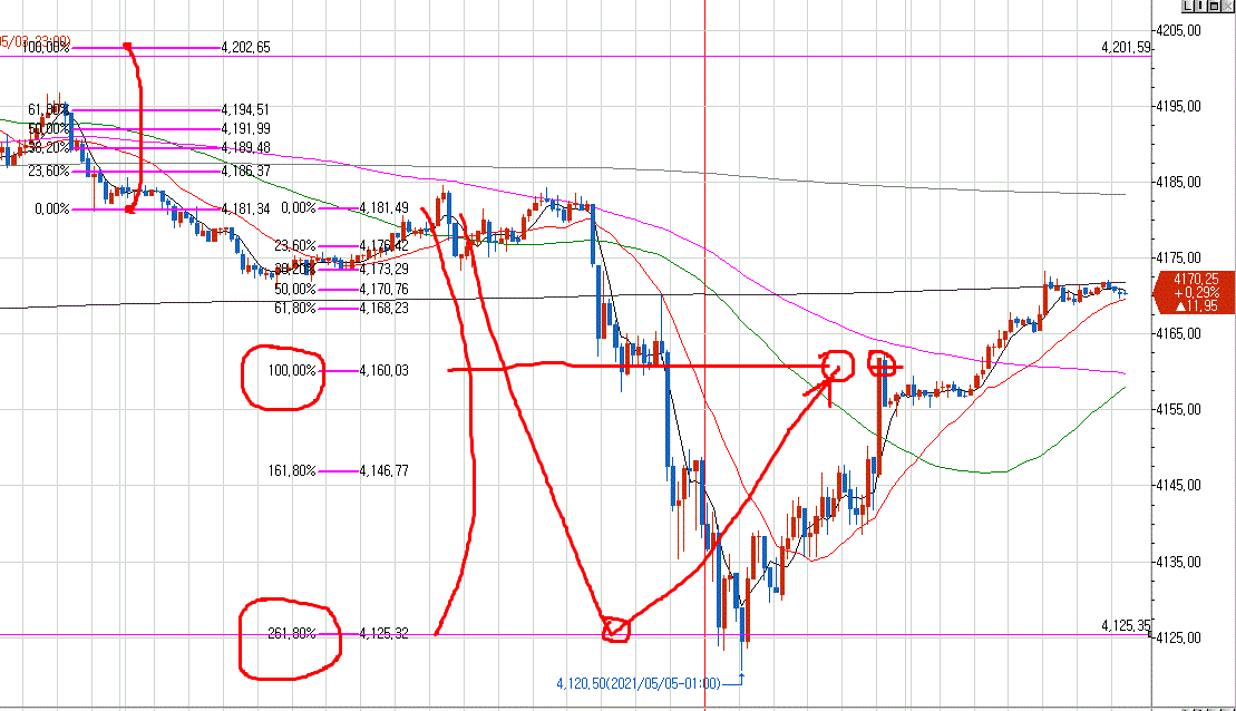 그래프는 전일대비 피보나치 수열이 -261.80% 매수후 -100% 청산 입니다.
