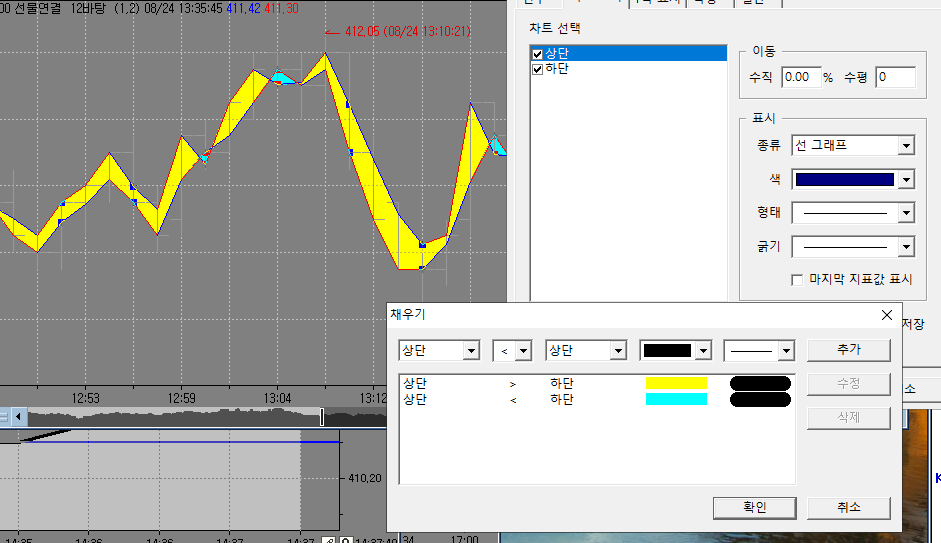 2개 이평선사이에 조건에 맞는 색을 넣고싶습니다