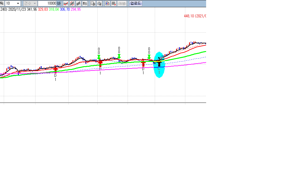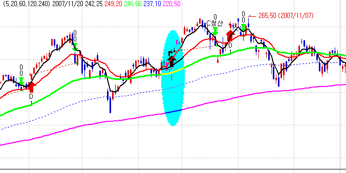 시스템식에서는 5, 20, 60, 120, 240 이평이 사용되었는데, 지표식으로 그려진 것은 이와 다른 이동평균선이 적용되어 있습니다.