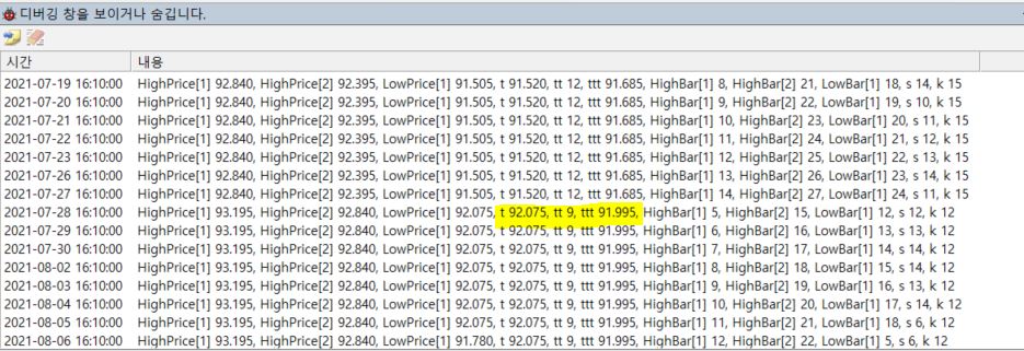 MessageLog("HighPrice[1] %.3f, HighPrice[2] %.3f, LowPrice[1] %.3f, t %.3f, tt %.0f, ttt %.3f, HighBar[1] %.0f, HighBar[2] %.0f, LowBar[1] %.0f, s %.0f, k %.0f",