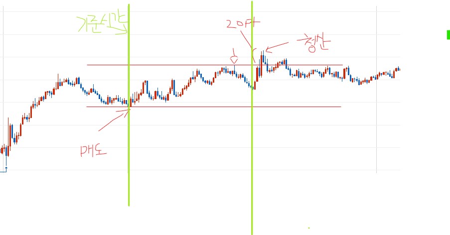 예) 10시에서 11:50 분까지 기준으로 진입된 반대방향 봉으로 12시 이후부터 +50포인트시 청산입니다.