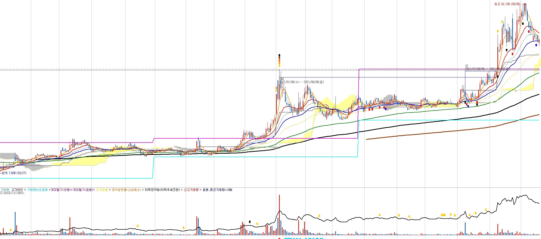 그이후 2021년 8월 9일 244일 신고가 41,000원 돌파했습니다. 그리고 이전 일봉과 2일전 일봉은 모두 양봉이었습니다.