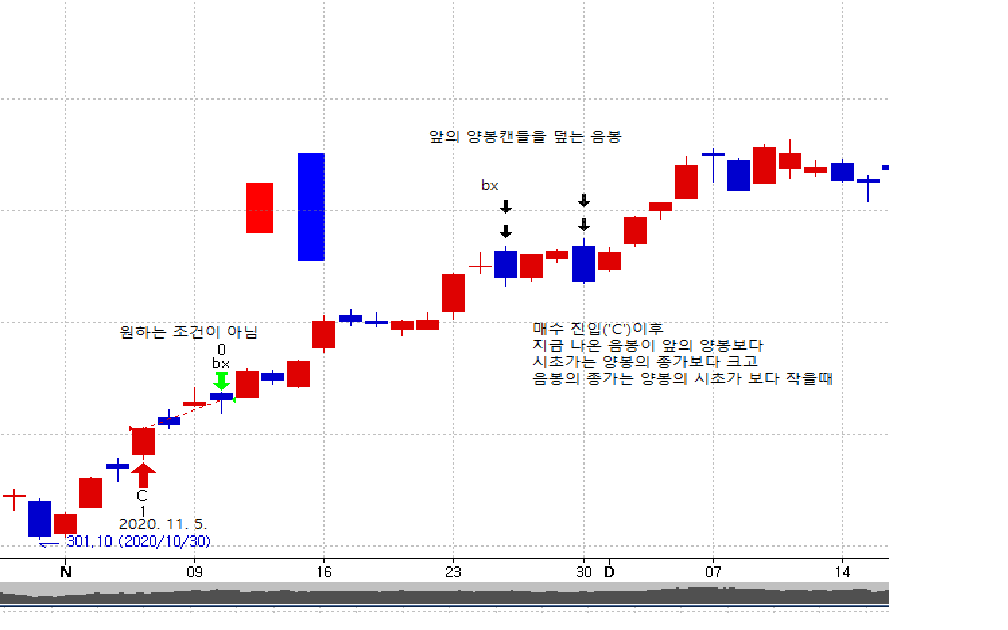 그 음봉의 시초가는 앞 양봉의 종가보다 크고, 음봉의 종가는 앞 양봉의 시가보다 작다