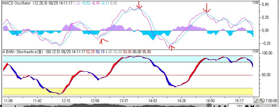 2번 MACD 오실레이터의 장단기 골든크로스및 데드크로스시 화살표가 표시되도록 지표 부탁드립니다.,
