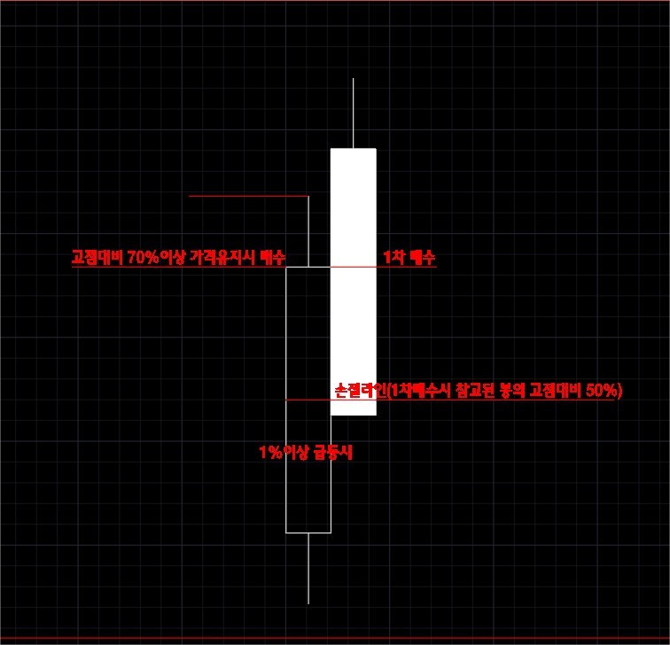 1차 매수시 참고된 봉에서 가격이 50%이하로 빠지면 손절.