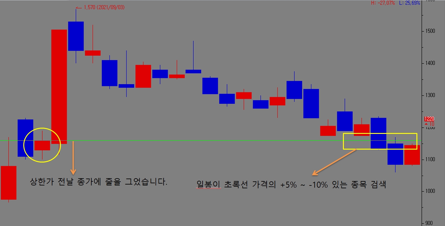 현재의 일봉이 선(이미지 파일 초록색 선)의 가격 범위 +5% ~ -10% 에 위치하고 있는