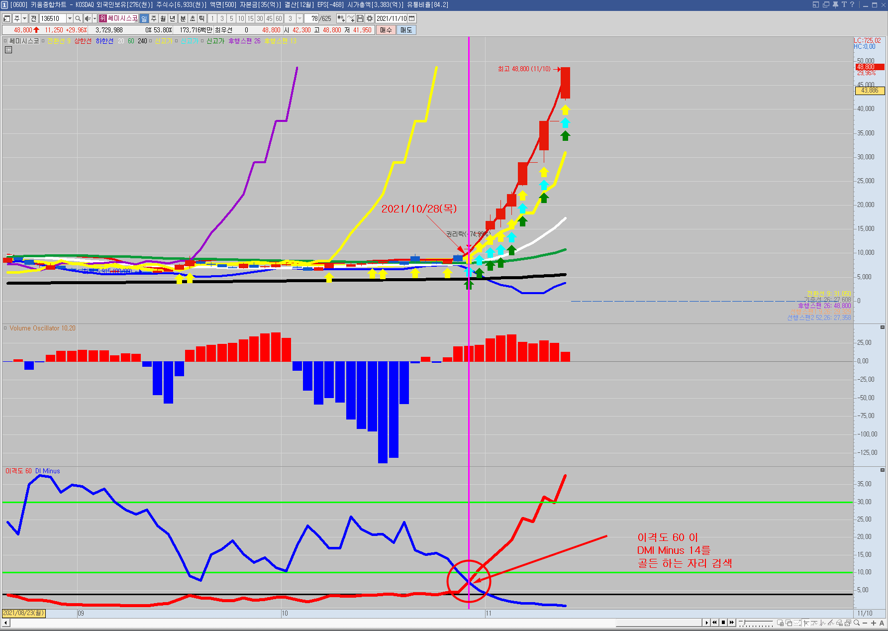 이격도 60 이 DMI Minus 14를 골든 크로스 하는 종목을 검색하고 싶은데