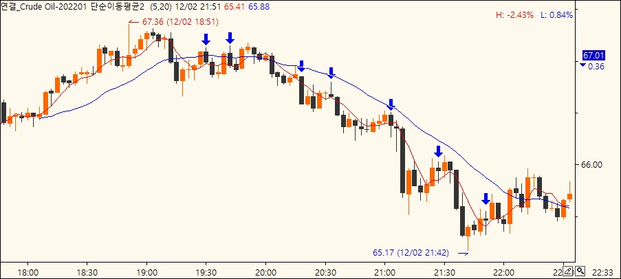 1. 이동평균 20일 상단에 5일이 있고 캔들이 음봉으로 5일을 돌파한 후