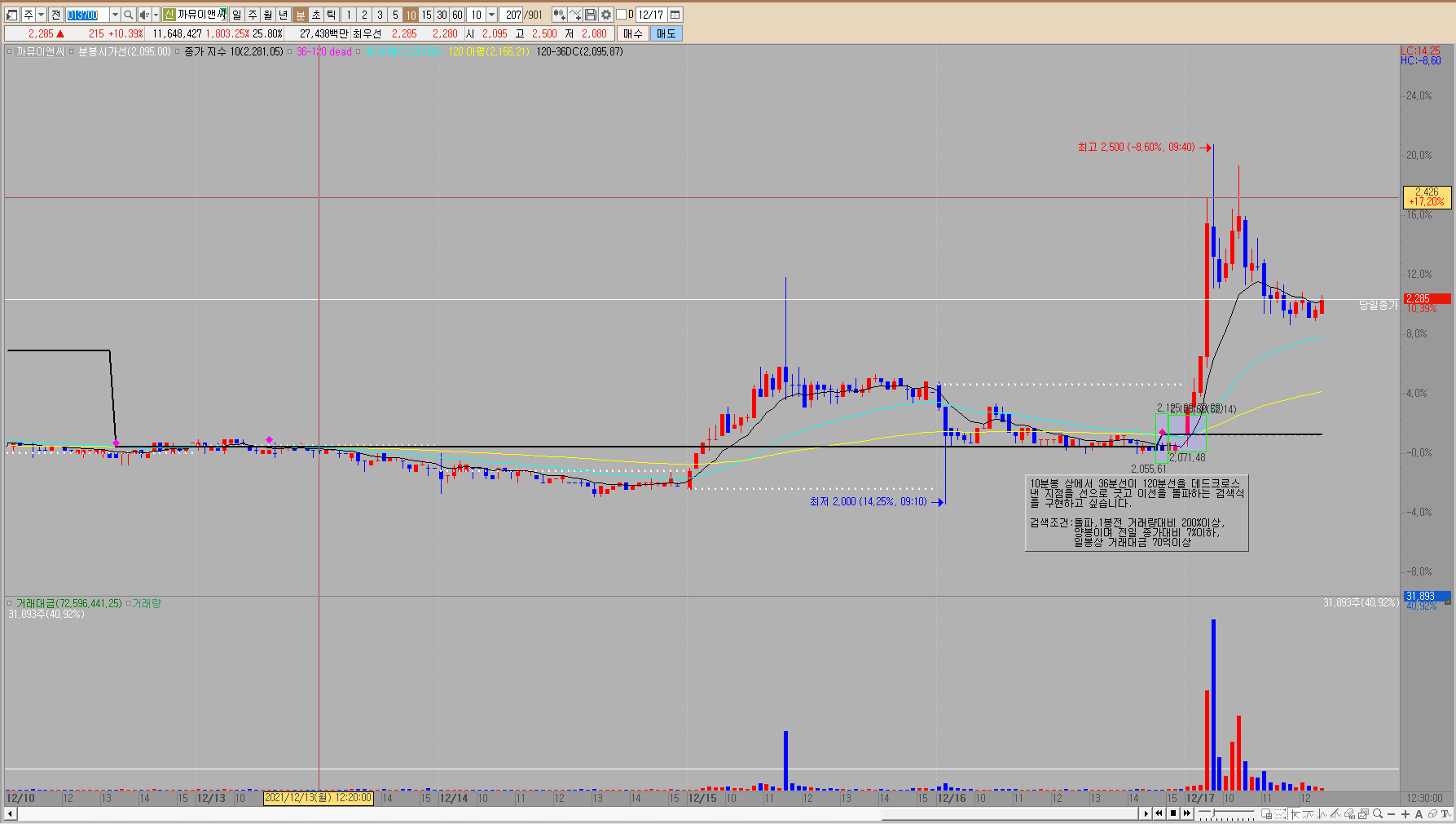 > 10분봉상에서 36분선이 120분선을 데드크로스 낸 지점을 선으로 긋고 이 선을 돌파하는 검색식을 구현 하고 싶습니다..