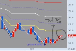 (사진설명: 저점 발생후 원표시처럼 현지수와 고점이 계속적으로 연결되어 나타나다가 지수하락시 고점형성 후 저점과 지수연결되는 모양)