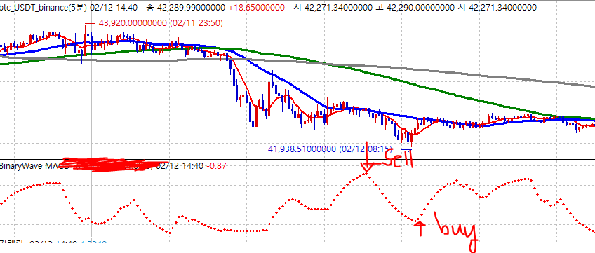 > 1. BWMACD 가 극대값일때는 매도 신호 화살표로 표시 하고 싶습니다.(소리 알람)