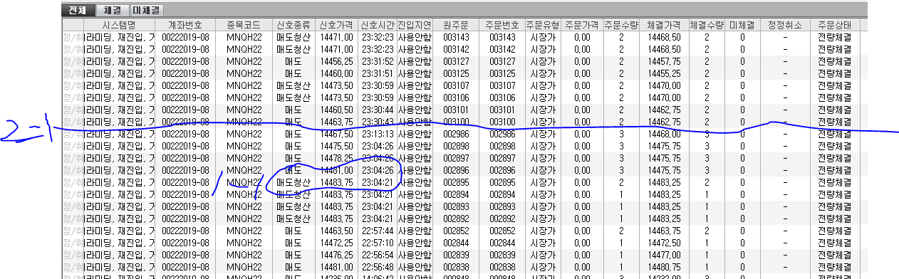 '청산 => 재진입'이 일어난 시간을 확인해보면 5초의 갭이 있어 청산-매수 시점이 겹쳐 생긴 문제는 아닌듯 (1-1)