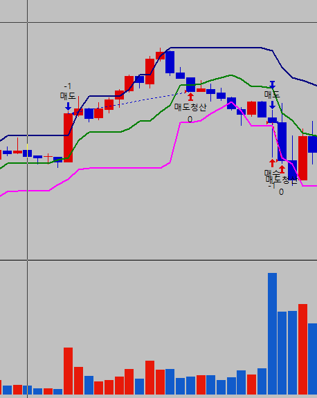 (고점+저점)/2에 닿으면 매수 또는 매도청산 수식입니다