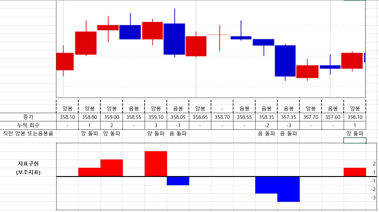 예: 음봉 360 -> 양봉 -> 음봉 358 -> 양봉 -> 음봉 359 -> 양봉 -> 음봉 358 -> 양봉 360 -> 양봉 361